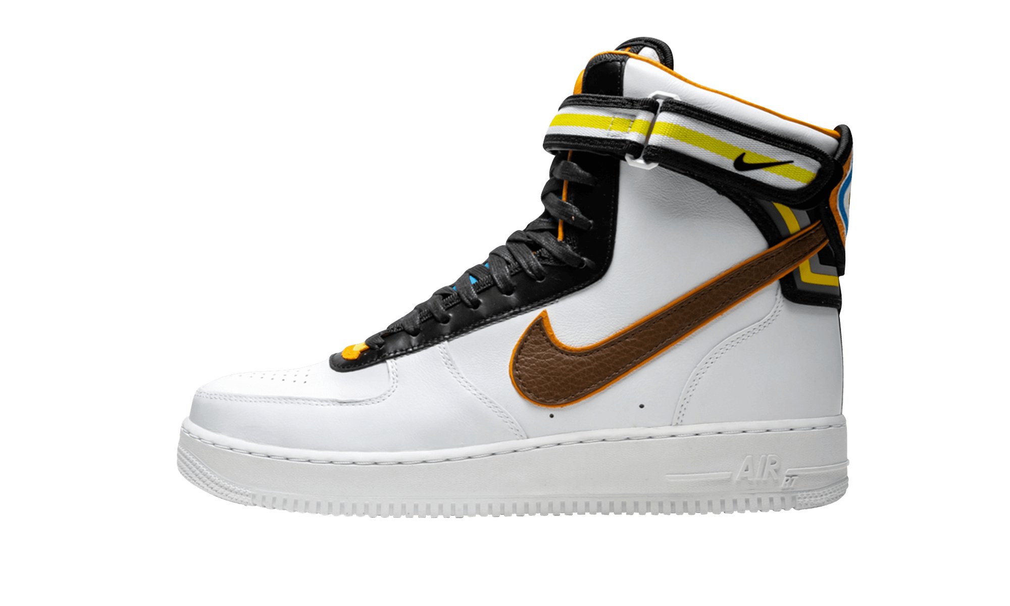 The Nike Air Force 1 gets an update for this bold collaboration with Italian fashion designer Riccardo Tisci. The Air Force 1 Hi SP Tisci features a modified design by Tisci with an extra high top and added paneling with striped motifs. The head-turning sneaker is crafted in premium white leather, with an ankle strap featuring woven polyester webbing. The shoe’s tongue is accented with colorful overlays, while multicolor details also appear on the heel branding. A full-grain leather Swoosh is featured on the side panels, and a low-profile Phylon midsole includes an encapsulated Air unit for cushioning. White