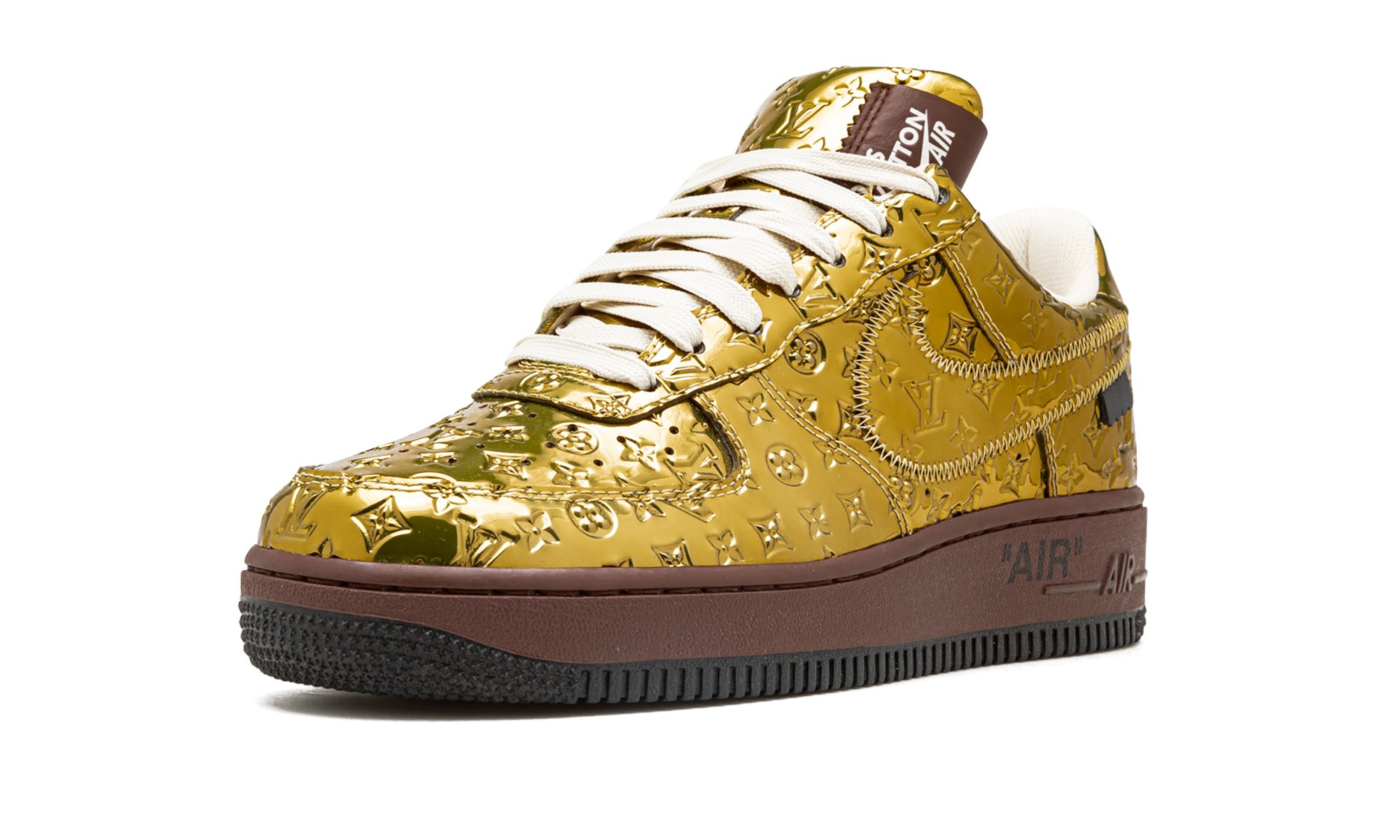 The Louis Vuitton x Nike Air Force 1 Low “Metallic Gold is the coveted golden colorway included in the special collaboration between the storied high fashion house and Nike that was directed by the late Virgil Abloh. One of multiple colorways of the Air Force 1 produced by Louis Vuitton, Nike, and Abloh in 2022, the “Metallic Gold” features a monochromatic gold leather upper with Louis Vuitton’s famous monogram print stamped into the material. A stitched Swoosh outline appears on both sides of the shoe. Signature details include a reworked “Louis Vuitton Air Force 1” logo on the side of the tongue, and a brown tab on the lateral side of the Swoosh on the mid-panel. The shoe rides on a brown rubber sole. Made in Italy. Virgil Abloh – Metallic Gold