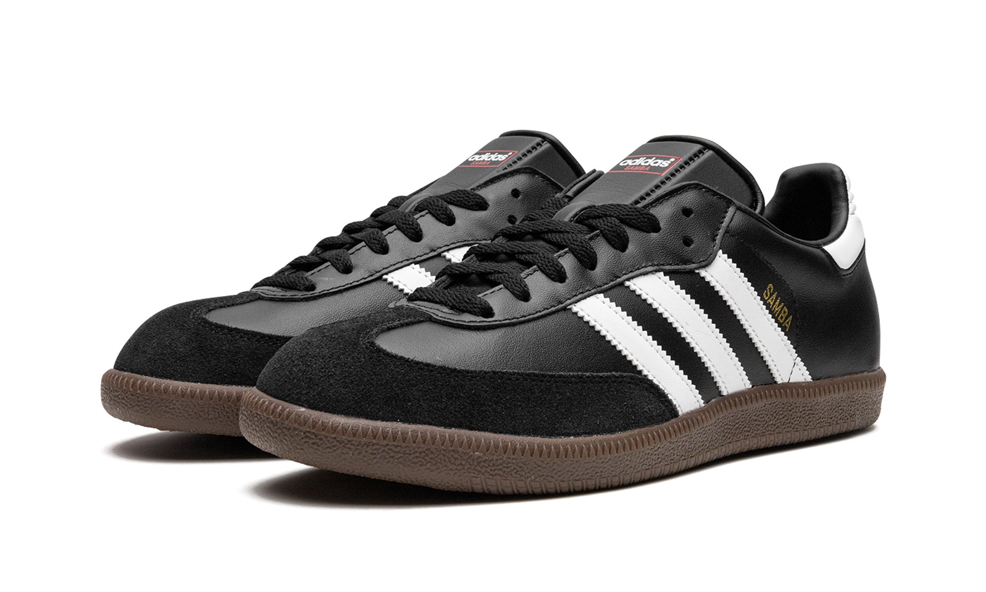 The adidas Samba “Black” is the versatile, black-based colorway of the popular indoor soccer and lifestyle shoe. The classic “Black” adidas Samba features a black leather build with a tonal suede overlay on the toe. Contrasting white leather Three Stripes detailing can be found on either side of the shoe. Gold foil “Samba” branding appears next to the logo on the lateral side. The shoe rides on a gum rubber sole.
