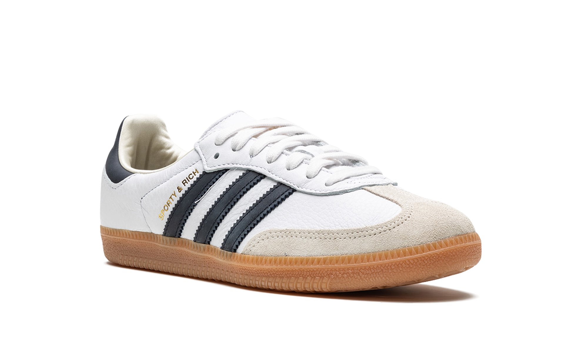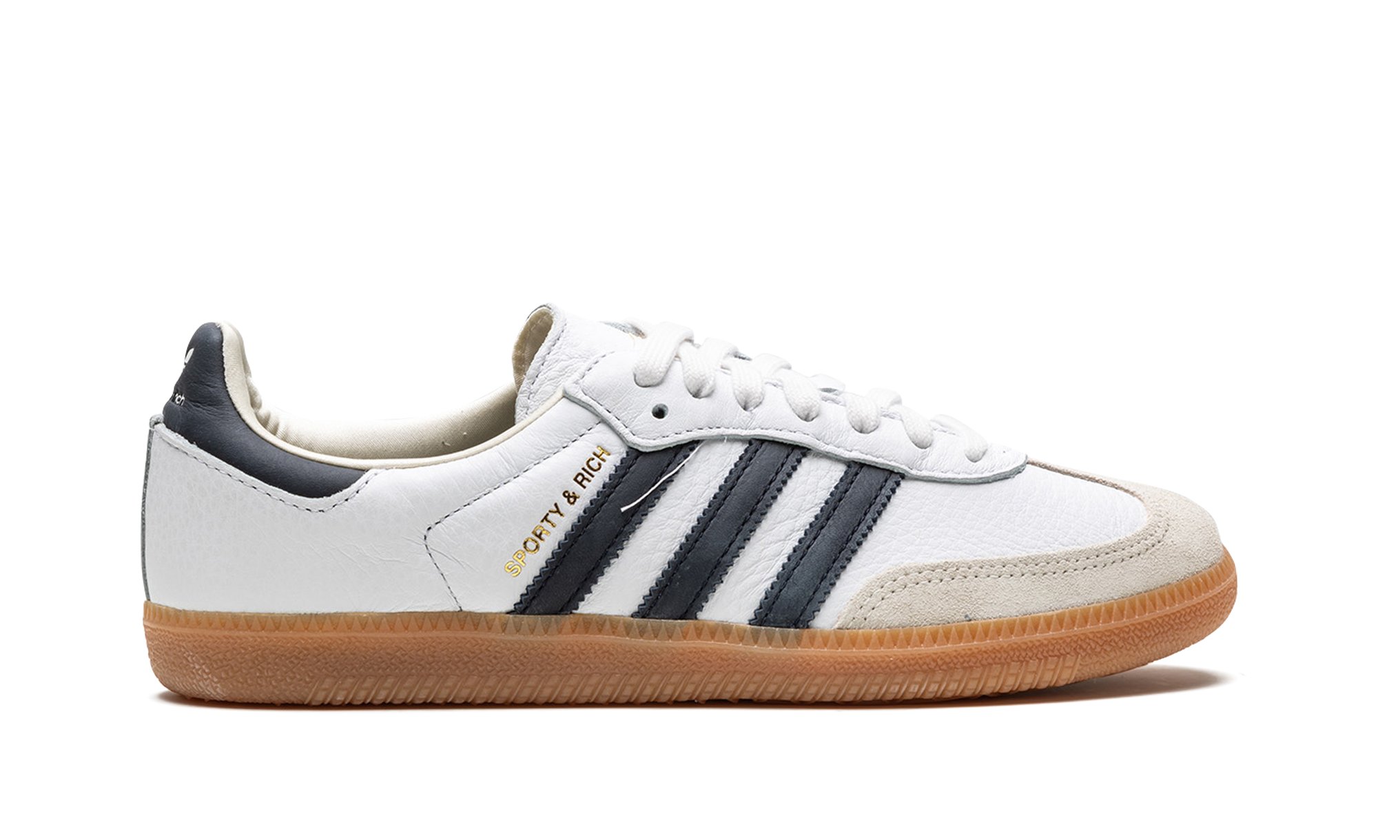 The Sporty and Rich x Women’s adidas Samba “White/Black” is a women’s-exclusive colorway of the popular sneaker from the collaboration by Emily Oberg’s sportswear brand. Sporty and Rich’s adidas Samba in the timeless “White/Black” colorway features a premium white leather construction with a tan suede toe overlay. A black leather Three Stripes logo is found on the sides next to black “Sporty and Rich” branding. Dual “adidas” and “Sporty and Rich” detailing appears on the heel tab. Classic adidas Samba branding is located on the tongue. A gum rubber sole completes the look. Release date: May 4, 2023
