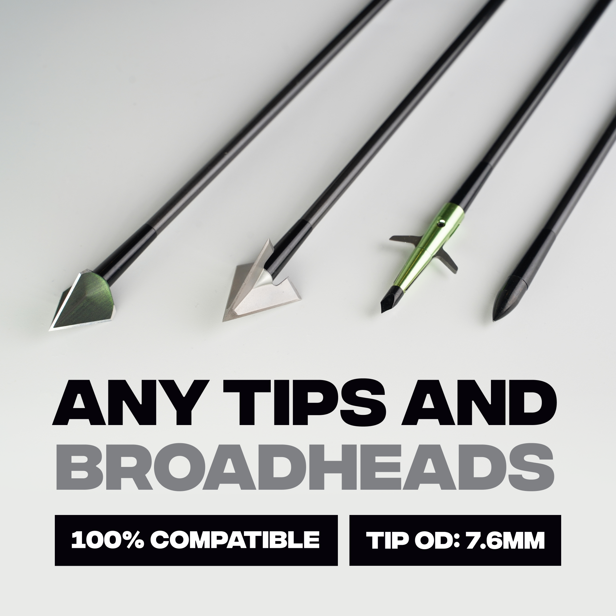These bolts are compatible with all standard broadheads and field tips (7.6mm OD). Their micro-diameter construction reduces wind drift, improves stability in flight, and maintains higher velocity over longer distances. The result is a bolt that drills into the target with surgical efficiency — ideal for both hunting and high-performance practice.