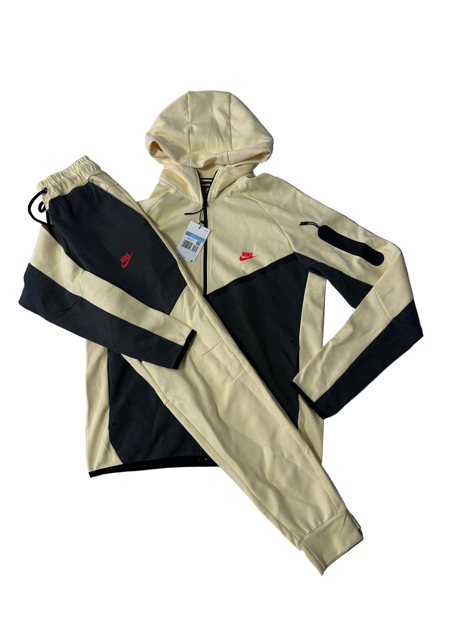 Acest trening Nike Tech Fleece este compus din hanorac cu glugă și pantaloni, realizat într-un design modern cu combinație de culori galben deschis și gri închis.